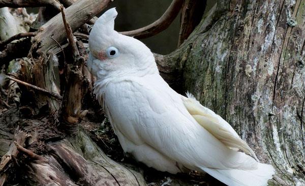 頭體長30-34cm。體型很小,羽色純白透出些許的粉色。眼先有一塊清晰的粉紅色板塊,臉頰和耳覆羽透出淡黃色的色彩。翅膀和尾巴下,有內(nèi)螺紋黃色。喙是灰白色。眼圈偏藍(lán)的白色。虹膜為褐色,腳黑灰色。特點(diǎn)是嘴粗厚而強(qiáng)壯,上嘴向下鉤曲,兩側(cè)的邊緣有缺刻,基部具蠟?zāi)?。上嘴與頭骨的連接猶如絞鏈一樣,能活動(dòng)自如。翅形稍尖,腿短健,腳上有四趾,前后各有兩趾,稱為對趾型,爪尖銳而彎曲,適于攀樹。