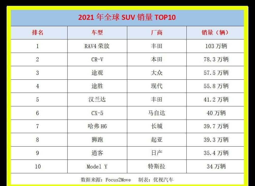 數(shù)據(jù)來(lái)源方面,我們以國(guó)際調(diào)查機(jī)構(gòu)Focus2Move在前不久公布的2021年全球SUV銷(xiāo)量報(bào)告為標(biāo)準(zhǔn)。要知道,F(xiàn)ocus2Move的全球汽車(chē)數(shù)據(jù)庫(kù)已經(jīng)收集了全球超過(guò)300個(gè)地區(qū)的汽車(chē)數(shù)據(jù)庫(kù)資料,因此數(shù)據(jù)十分全面,統(tǒng)計(jì)也較為精確,故而具有很強(qiáng)的公信力與參考性。下面話不多說(shuō),咱們趕緊來(lái)具體地看下榜單。