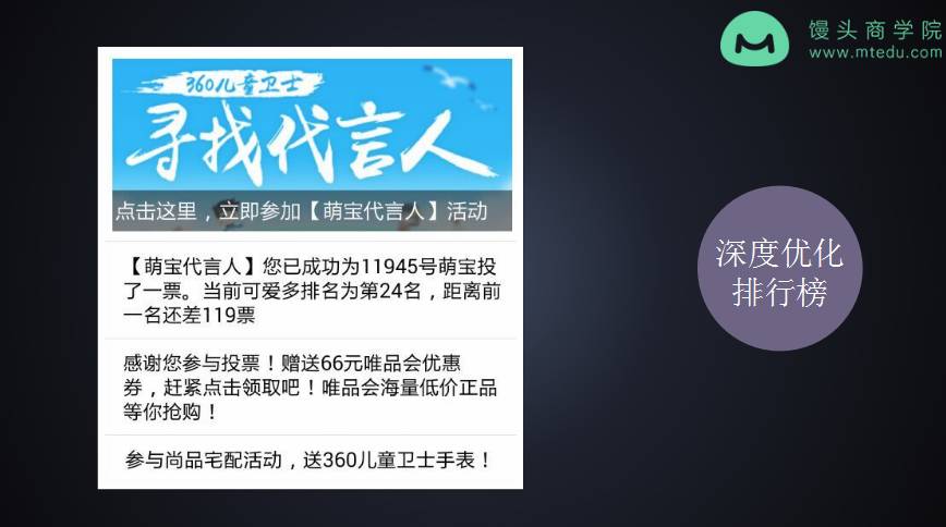 還是以剛才的萌寶投票活動舉例。我們的主題是360兒童衛(wèi)視尋找代言人活動。為了能夠讓更多的人參與進來。我們在里面埋入了當時很火的幾個小童星。這樣就會給父母一個感覺,我是在跟某某童星同臺競技,我們家的孩子并不比童星差,會讓他更有動力來參加活動。這個引爆點幫助我們吸引了更多有影響力的家長來參加活動。有影響力的家長來參加我們活動之后,他們的拉票積極性和能量是非常巨大的。
