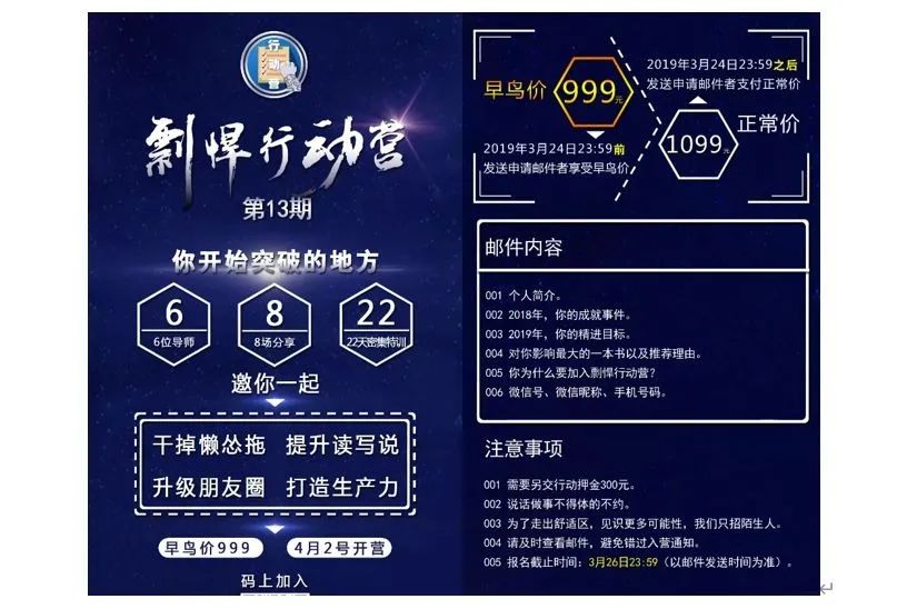 去年這個時候,為了順利轉(zhuǎn)行、親身感受運營的工作內(nèi)容和節(jié)奏,我付費999元參加了傳說中的“剽悍行動營”一探究竟。