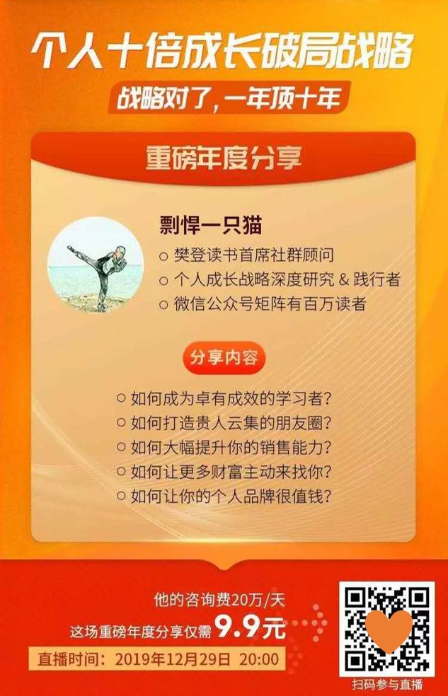 1. 剽悍一只貓的IP帶動:每年年底,剽悍一只貓都會舉辦在線年度個人分享大會, 2019年底的分享,僅開播3小時內(nèi)收聽人次高達23萬。本人聽過2018年的貓叔分享,干貨的確不少(不過必須要親自實踐才有效),整個過程聽下來一個感覺:廢話少,感覺爽。