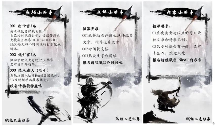 5. 宣傳材料風(fēng)格不統(tǒng)一:我看到的就有金屬深色系的、萌蠢少女風(fēng)的、傳統(tǒng)中國風(fēng)、中規(guī)中矩風(fēng)等,風(fēng)格過于五花八門。如果行動營能夠形成一套同風(fēng)格的宣傳材料(海報、入學(xué)通知、日常卡片、榮譽證書等等),逼格又能更上一層樓。