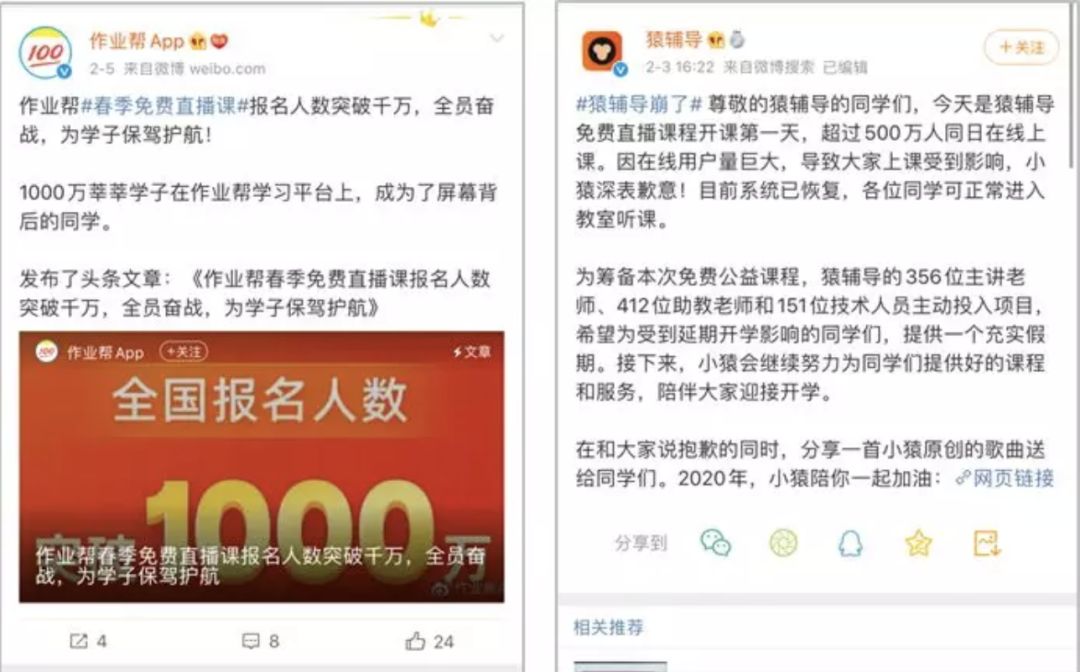 新冠病毒肆虐,全國(guó)人民開(kāi)始了大門(mén)不出二門(mén)不邁的生活。起初大家是幸福的,現(xiàn)實(shí)卻是殘酷的,本以為在家遠(yuǎn)程辦公可以邊吃邊喝、躺著開(kāi)會(huì),實(shí)際卻是會(huì)議不停消息不斷,甚至還要開(kāi)視頻會(huì)議,逼著自己不得不上半身西裝下半身睡褲。 員工在家辦公雖然比在辦公室更累,效率更低,但和線下老板們相比要幸運(yùn)得多,因?yàn)榇蠖鄶?shù)基于線下流量的產(chǎn)業(yè)均受到此次疫情的巨大影響,比如線下餐飲企業(yè)西貝曾對(duì)外發(fā)聲僅能維持三個(gè)月,再比如很多中小線下教育機(jī)構(gòu)紛紛宣布破產(chǎn),解雇全部員工,整個(gè)線下可以用慘淡來(lái)形容。 野生運(yùn)營(yíng)社區(qū)是聚焦在線教育領(lǐng)取的自媒體,自然要關(guān)注在線教育在此次新冠病毒肺炎疫情中的表現(xiàn),總體可以用兩個(gè)字來(lái)形容--幸運(yùn)。 之所以稱(chēng)為幸運(yùn),首先是在線教育這樣基于互聯(lián)網(wǎng)的商業(yè)模式天然適合特殊時(shí)期幫助企業(yè)轉(zhuǎn)型和生存,現(xiàn)實(shí)也證實(shí)這一點(diǎn),幾乎全國(guó)線下教育機(jī)構(gòu)紛紛緊急轉(zhuǎn)到線上保證已有學(xué)員能繼續(xù)在機(jī)構(gòu)上課,來(lái)避免因?yàn)橐咔槎F(xiàn)金流斷裂。其次,教育部出于疫情防控的角度,延遲了全國(guó)學(xué)校開(kāi)學(xué)時(shí)間,并且積極推動(dòng)在線學(xué)習(xí)方式,但限制了學(xué)習(xí)內(nèi)容,這讓在線教育企業(yè)紛紛推出符合政策的內(nèi)容來(lái)促進(jìn)最新一波增長(zhǎng)。 實(shí)際上,此次疫情對(duì)所有行業(yè)都會(huì)帶來(lái)一些負(fù)面影響,在線教育也是如此,沒(méi)有一件事是百利而無(wú)一害,也沒(méi)有一件事是百害而無(wú)一利,重點(diǎn)是我們?cè)诿鎸?duì)危機(jī)到來(lái)時(shí),如何做到止損,甚至實(shí)現(xiàn)新的增長(zhǎng),這也是寫(xiě)作本文的目的。 在疫情爆發(fā)初期,頭部在線教育機(jī)構(gòu)的反應(yīng)是非??斓模娂娋栀?zèng)百萬(wàn)千萬(wàn)份免費(fèi)課程支援疫區(qū),后來(lái)因?yàn)橐咔榈臄U(kuò)大逐漸影響到學(xué)校,又陸續(xù)開(kāi)啟完全免費(fèi)的公益課程服務(wù)。 圖片來(lái)自?xún)|歐 當(dāng)然,頭部在線教育機(jī)構(gòu)們不是簡(jiǎn)單的推出公益課程,而是有相對(duì)系統(tǒng)的打法,目的顯然是為增長(zhǎng)服務(wù)。 1、推出面向全年級(jí)的公益直播課 頭部在線教育公司面對(duì)此次疫情推出的核心打法是推出面向全年級(jí)的公益課,比如學(xué)而思網(wǎng)校、猿輔導(dǎo)、作業(yè)幫等。有目共睹的是,公益課效果非常好,猿輔導(dǎo)宣稱(chēng)同時(shí)500萬(wàn)人在線上直播課,作業(yè)幫宣布公益課報(bào)名突破1000萬(wàn)人。 圖片來(lái)自運(yùn)營(yíng)研究社 筆者看了幾個(gè)頭部的公益課內(nèi)容,大體分兩部分:一部分是基于校內(nèi)的同步課程,這是公益課的核心部分,尤其以寒假課程為主,而隨著疫情的持續(xù),這些在線教育公司不出意外會(huì)上線春季的同步課程,不符合教育部規(guī)定的則會(huì)嚴(yán)格限制,比如超前學(xué)習(xí);另一部分是素養(yǎng)課程、公益講座等,比如學(xué)而思網(wǎng)校的免費(fèi)素養(yǎng)課、猿輔導(dǎo)的大師講座、有道的“疫情防控第一課”等,目的是豐富學(xué)生的線上學(xué)習(xí)內(nèi)容,在疫情期間培養(yǎng)綜合能力。 正是因?yàn)橥瞥雒赓M(fèi)公益課策略,所有頭部在線教育機(jī)構(gòu)每天都有大量流量涌入,放在過(guò)去這是很難想象的,而在疫情期間面對(duì)成百上千萬(wàn)的用戶(hù),在線教育機(jī)構(gòu)務(wù)必保證公益課質(zhì)量,為后續(xù)的口碑轉(zhuǎn)化打下良好基礎(chǔ)。 2、在流量平臺(tái)同步內(nèi)容和推廣 除了推出公益課,如何讓公益課大規(guī)模曝光并吸引流量也是頭部在線教育公司們考慮的問(wèn)題,巧合的是,主流互聯(lián)網(wǎng)平臺(tái)以及官媒因?yàn)橐咔榈男枰娂娡瞥隽斯鎸W(xué)習(xí)模塊,這為在線教育公司提供了品牌曝光的絕佳契機(jī)。 各大在線教育公司主要在這樣幾類(lèi)平臺(tái)同步內(nèi)容和投放推廣。 一類(lèi)是官媒平臺(tái),比如在央視頻和學(xué)習(xí)強(qiáng)國(guó),猿輔導(dǎo)、作業(yè)幫、學(xué)而思網(wǎng)校等頭部在線教育公司就在這一類(lèi)平臺(tái)同步直播公益課程,并且紛紛獲得人民日?qǐng)?bào)、新華社、CCTV等官媒的報(bào)道,大大提升品牌曝光度。 另一類(lèi)是在主流互聯(lián)網(wǎng)平臺(tái)比如今日頭條、抖音、快手、西瓜視頻、優(yōu)酷、愛(ài)奇藝、騰訊視頻等同步公益課程內(nèi)容,一般分為錄播和直播兩種形式,具體形式依據(jù)平臺(tái)而定,比如在抖音和快手就可以直播同步公益課內(nèi)容,可以借助平臺(tái)的流量扶持為賬號(hào)漲粉。 第三類(lèi)是將自身的公益課程在外部進(jìn)行推廣,主要是自媒體投放和信息流投放,比如猿輔導(dǎo)和作業(yè)幫就在公眾號(hào)、今日頭條等進(jìn)行公益課程投放,通過(guò)引導(dǎo)報(bào)名免費(fèi)公益課程完成線索獲取。 對(duì)于中小機(jī)構(gòu),沒(méi)有錢(qián)和資源不建議與頭部玩家們競(jìng)爭(zhēng),但可以盡量嘗試參與流量平臺(tái)發(fā)起的公益課程活動(d