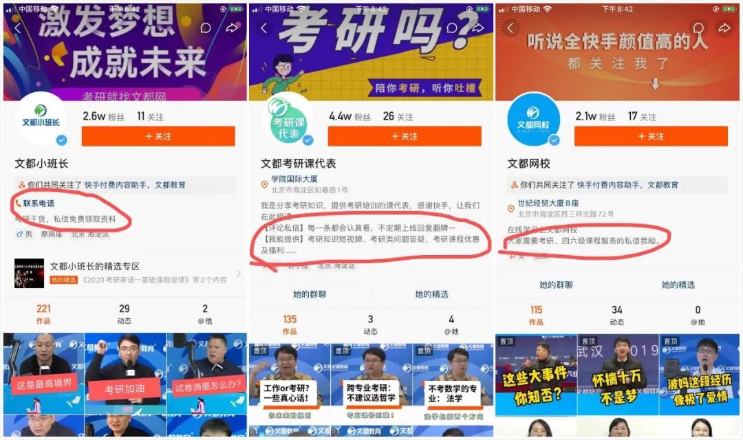 由此可見(jiàn),文都教育在快手上聚焦考研方向,目前累計(jì)有50w左右粉絲數(shù)量,其他教育方向以及各地區(qū)分校的賬號(hào)也在積極布局中。