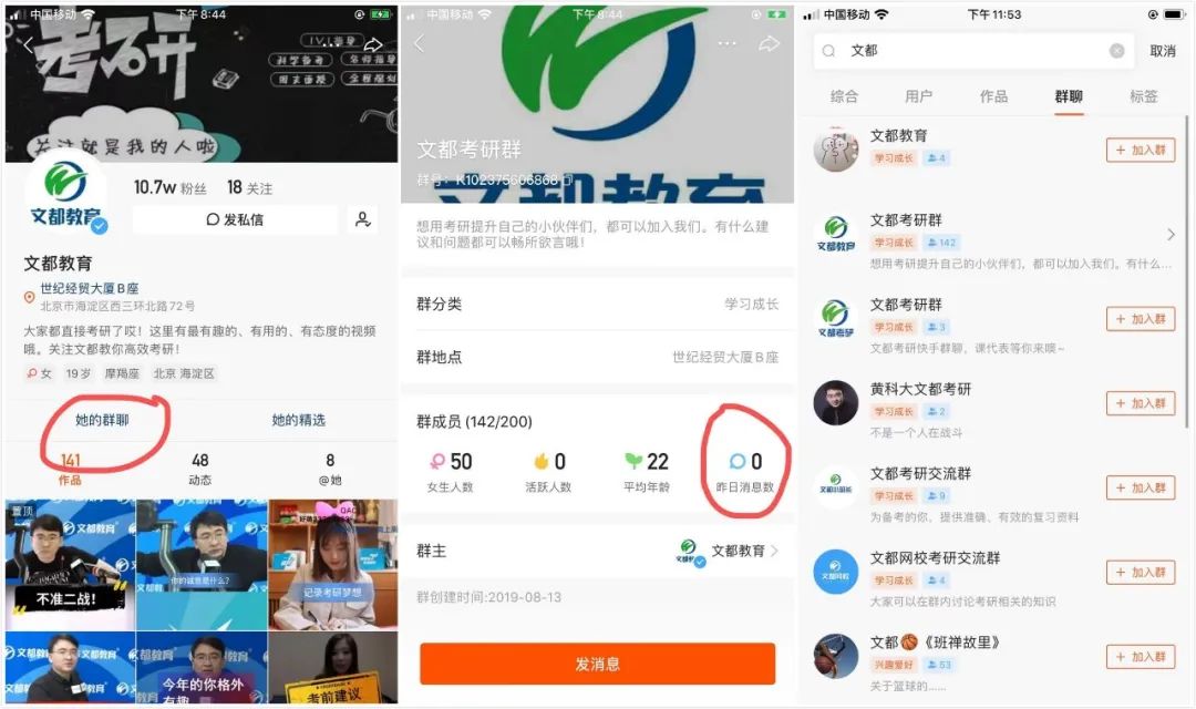 官方快手號(hào)會(huì)建立自己的群,進(jìn)入個(gè)人主頁(yè)即引導(dǎo)用戶進(jìn)群,關(guān)于“文都教育”的群共有十幾個(gè),只有一個(gè)人數(shù)超過(guò)100,且群內(nèi)活躍度很低,沒(méi)有管理。