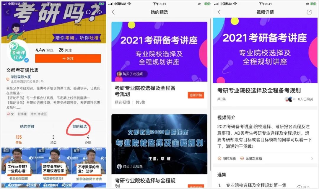 在一些官方號(hào)的主頁(yè),有“她的精選”標(biāo)簽,點(diǎn)進(jìn)去后,是免費(fèi)或低價(jià)試聽(tīng)課,這些視頻課程支付后可無(wú)限次試聽(tīng),內(nèi)容主題有關(guān)于考研宏觀方向把控的,也有熱門課程的試聽(tīng),如《19元解析英語(yǔ)長(zhǎng)句》等,單價(jià)在0-50元,成交量很少,最高的在60左右,最少的只有個(gè)位數(shù)。