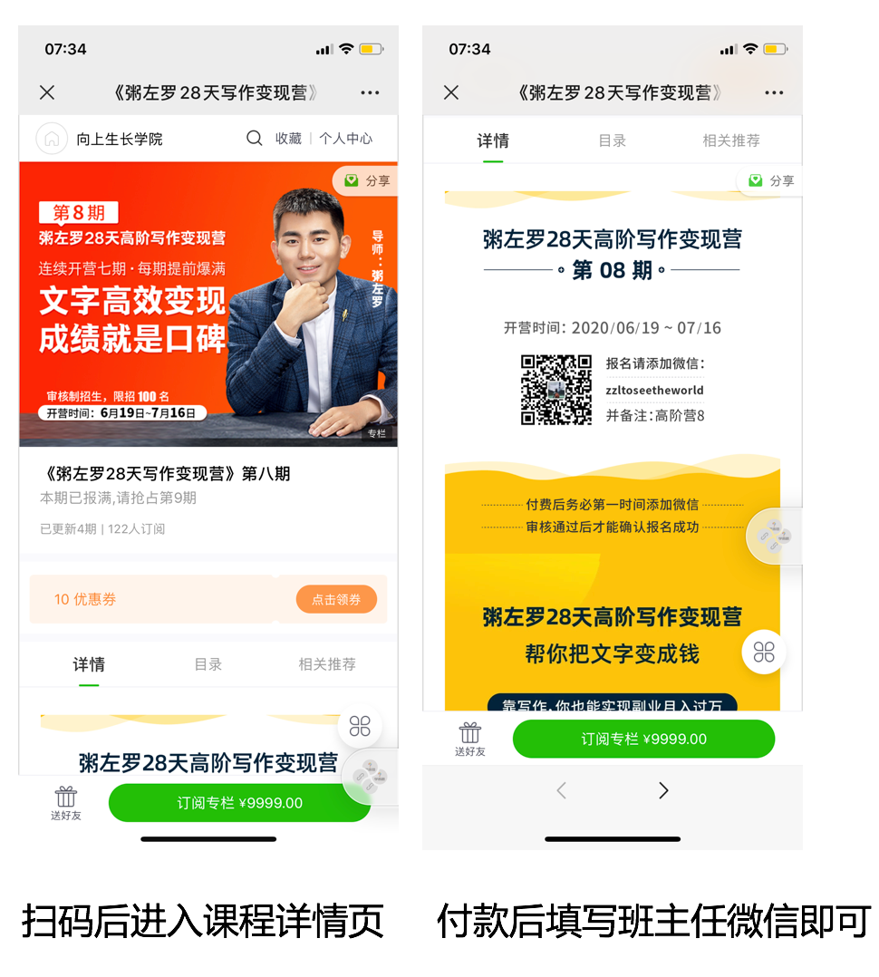 轉化路徑:看到推文/海報——掃碼進入課程介紹頁面——微信支付下單——添加班主任微信——通過后將付款截圖發(fā)給班主任。