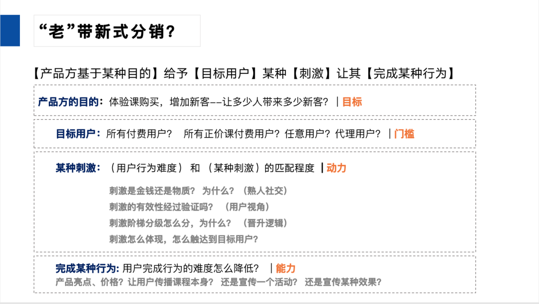 那我們來看老帶新分銷主要是什么?從產(chǎn)品的目的來看呢,肯定新客,這個就不贅述了。然后今天因?yàn)榻裉熘v的話主要是在講一個分銷的底層邏輯,所以說沒有什么固定的答案,就僅僅供參考的一個邏輯。