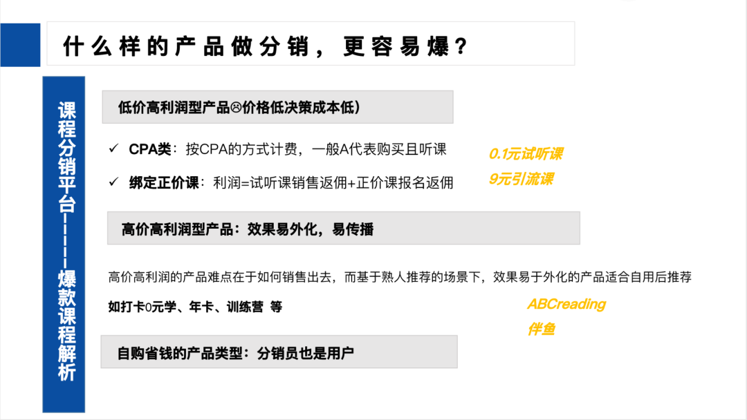 我們主要就是講了課程生產(chǎn)方跟課程分銷平臺之間,雙方如果想要達(dá)成需求的一致,那我們就需要能找出一些利潤高,然后容易售賣,且是新客型的產(chǎn)品來。那這個類型的產(chǎn)品我們大概分為3類:一種是低價(jià)高利潤的,一種是高價(jià)高利潤的。還有第三是適合自購的產(chǎn)品。