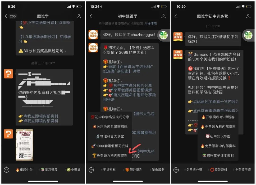 通過公眾號(hào)收到了活動(dòng)消息。在我分析了其他公眾號(hào)后并沒有發(fā)現(xiàn)其他跟誰學(xué)的公眾號(hào)發(fā)送了相應(yīng)的活動(dòng),但是在兩個(gè)公眾號(hào)的菜單欄找到了此活動(dòng),分別為初中跟誰學(xué),跟誰學(xué)初中訓(xùn)練營。應(yīng)該是對(duì)應(yīng)學(xué)部會(huì)設(shè)計(jì)對(duì)應(yīng)的引流產(chǎn)品及轉(zhuǎn)化路徑,分別放在不同的公眾號(hào)矩陣中進(jìn)行引流轉(zhuǎn)化。