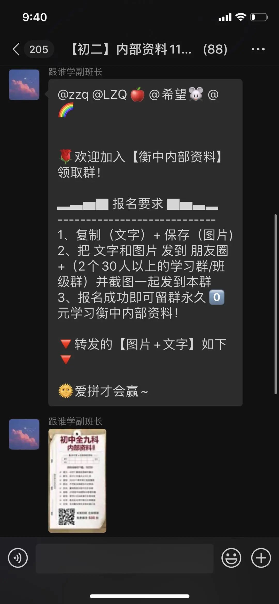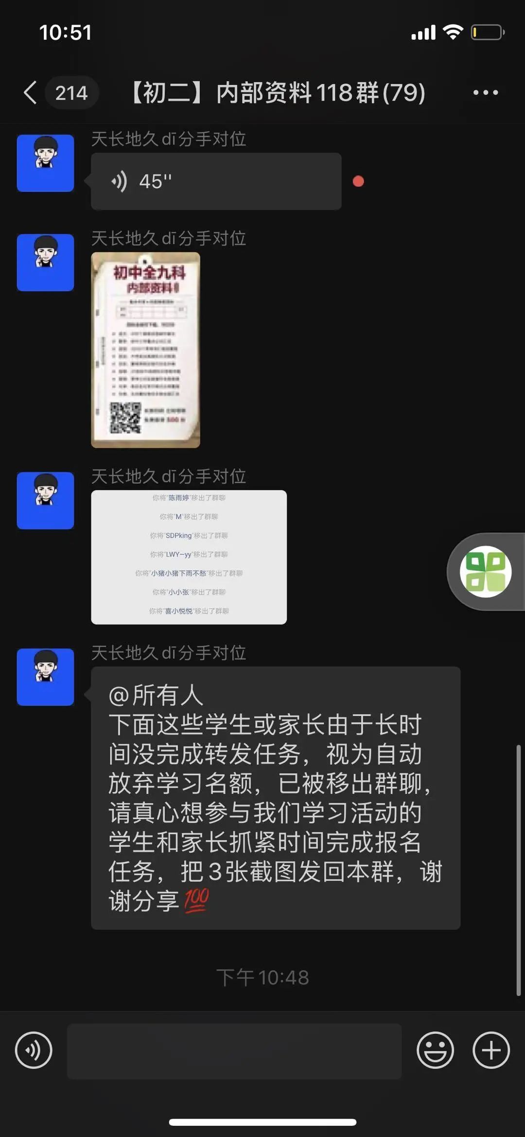 1.當(dāng)把三個(gè)截圖發(fā)到群里時(shí),助教過了大概五分鐘即被反饋活動(dòng)參與成功,但是讓我沒有想到的是,獲得的資料鏈接竟然直接發(fā)到了群里。這也就意味著其他家長(zhǎng)不需要轉(zhuǎn)發(fā)即可得到對(duì)應(yīng)的鏈接。非常打擊參與用戶。(這里可能目的是降低運(yùn)營成本,直接運(yùn)營社群即可)