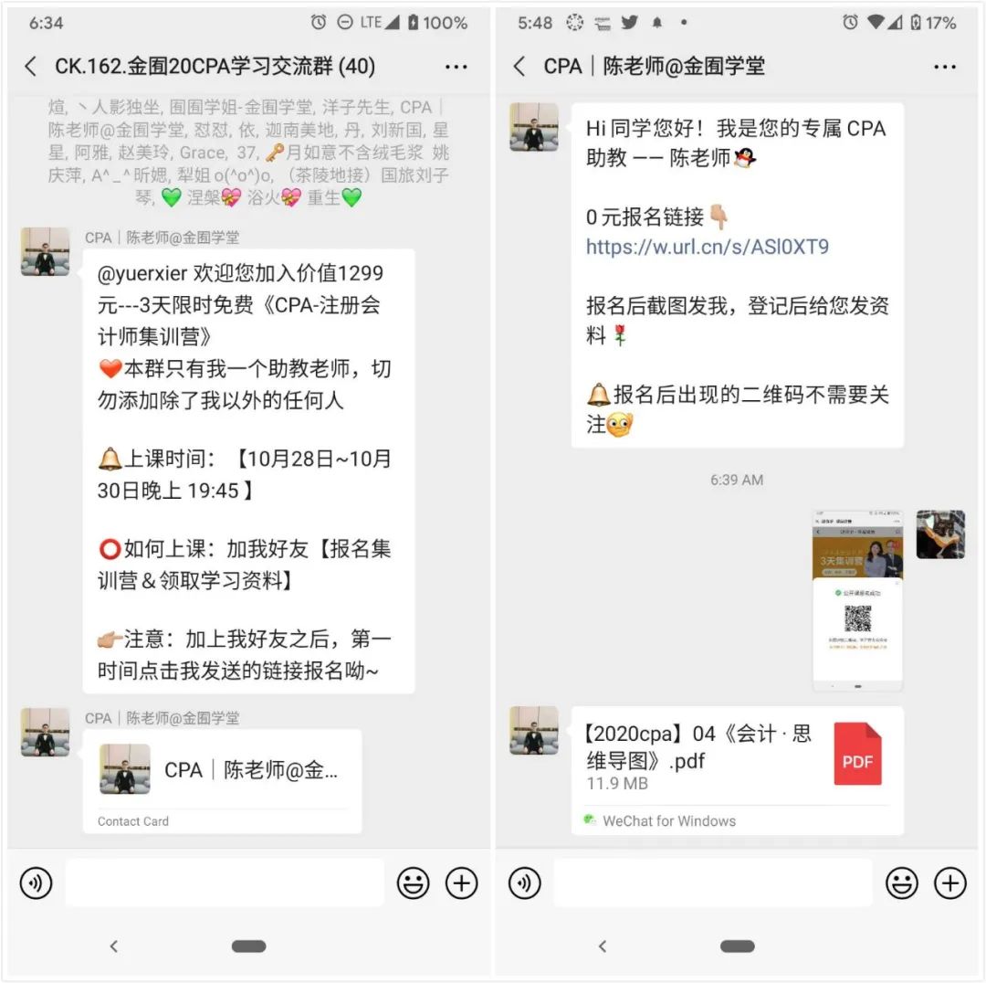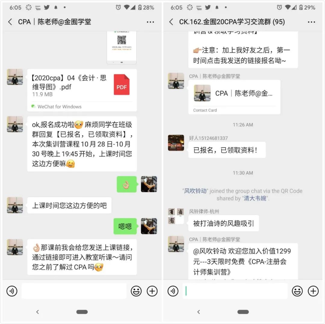 當(dāng)發(fā)送完會(huì)計(jì)思導(dǎo)圖資料后,助教老師便引導(dǎo)用戶去學(xué)習(xí)交流大群發(fā)送【已報(bào)名,已領(lǐng)取資料!】來(lái)向其他新進(jìn)群的用戶展現(xiàn)群內(nèi)的課程和資料的真實(shí)性,并且促使其他用戶盡快聯(lián)系助教并且完成課程報(bào)名動(dòng)作。助教老師還會(huì)后續(xù)詢問“上課時(shí)間是否方便”、“是否提前了解CPA”等。