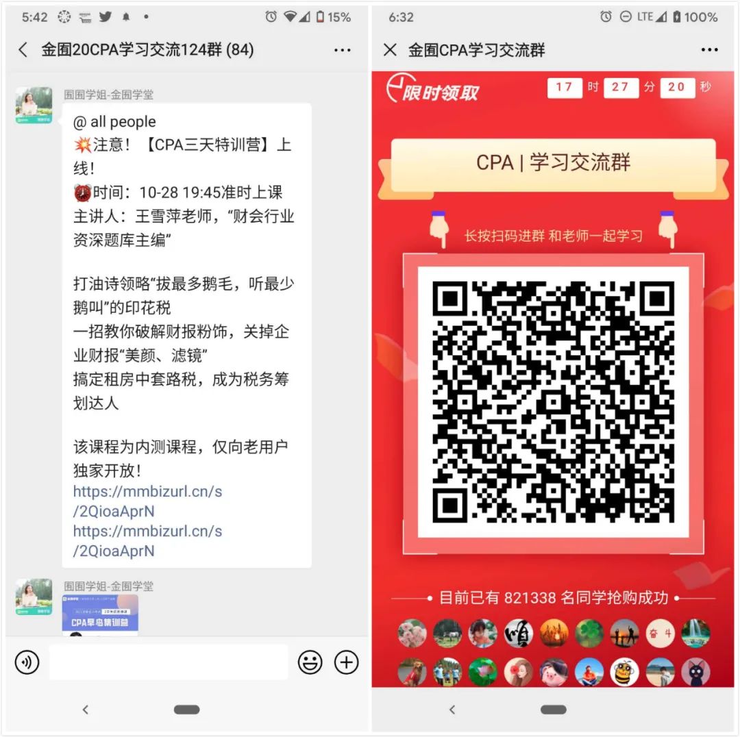 打開學(xué)習(xí)交流群,就可以看到最近的一次CPA三天特訓(xùn)營(yíng)(體驗(yàn)營(yíng))在10月28日19:45開始,點(diǎn)擊文本后的鏈接或者海報(bào)中的二維碼掃描,即可到中轉(zhuǎn)【CPA|學(xué)習(xí)交流群】二維碼頁(yè)面。頁(yè)面元素主要是有引導(dǎo)詞“長(zhǎng)按掃碼進(jìn)群,和老師一起學(xué)習(xí)”,有緊迫感,右上角的限時(shí)領(lǐng)取和時(shí)間,底部顯示已有821338名同學(xué)搶購(gòu)成功。