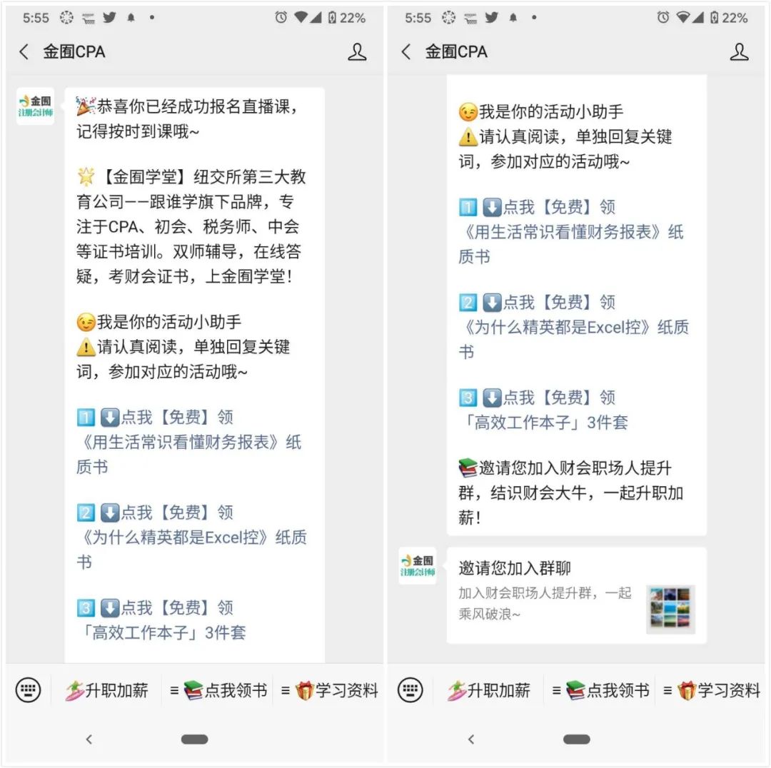 那為什么不讓用戶關(guān)注呢?原因就是除了這些以外,還會(huì)出現(xiàn)一個(gè)群邀請(qǐng)?zhí)崾?,而這個(gè)群卻是一個(gè)新的群,會(huì)引導(dǎo)用戶進(jìn)入其他課前銷售的群中。所以我個(gè)人覺得這是一個(gè)設(shè)置失誤,這個(gè)閉環(huán)沒有打造的很合理,如果能夠引導(dǎo)到公眾號(hào),可以為公眾號(hào)做引流,但是也會(huì)導(dǎo)致用戶重復(fù)關(guān)注公眾號(hào)(金囿學(xué)堂+金囿CPA),另外這個(gè)公眾號(hào)內(nèi)的群邀請(qǐng)也需要有所改動(dòng)。這個(gè)問題,在我之前的CFA體驗(yàn)課時(shí)也同樣如此。