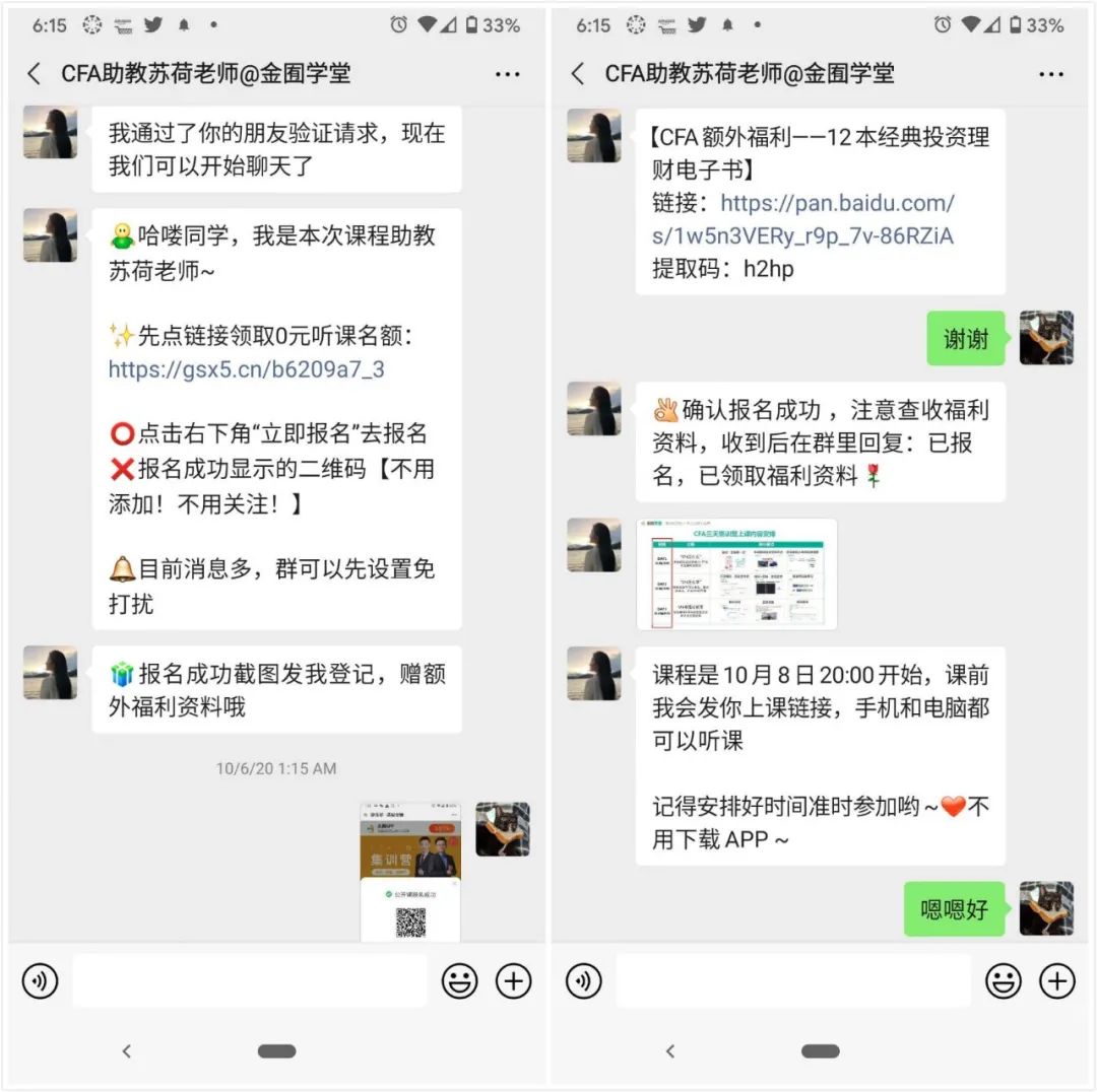 進(jìn)群后,可以看到目前人數(shù)為40,群內(nèi)據(jù)說(shuō)唯一的助教老師便自動(dòng)引導(dǎo)新進(jìn)群的每個(gè)用戶添加他為好友,等添加好后,他發(fā)送了一個(gè)【0元報(bào)名鏈接】,報(bào)名后截圖給他,登記后會(huì)發(fā)資料,這個(gè)跟我之前體驗(yàn)CFA課程的流程幾乎完全相同。