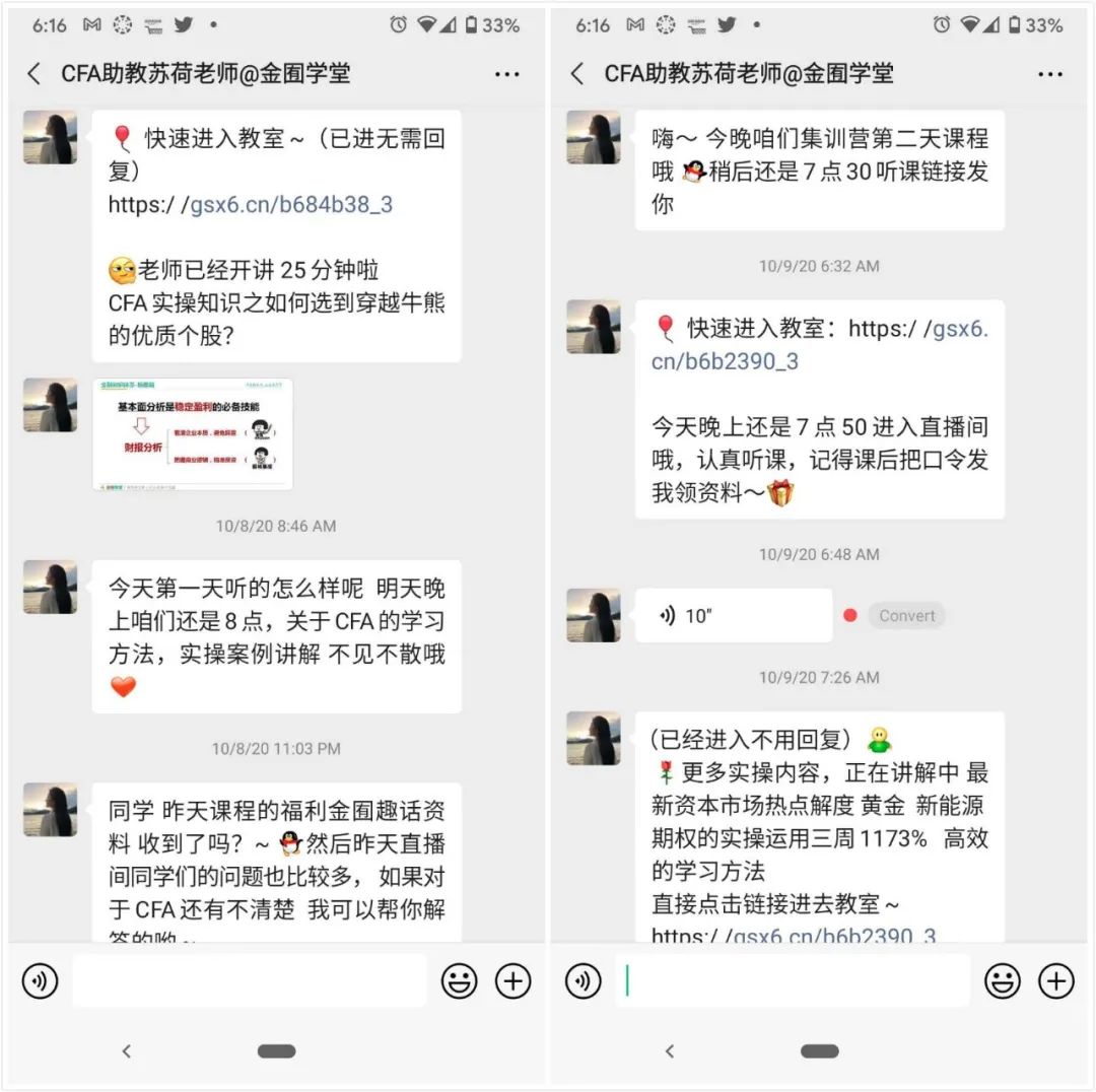 因?yàn)榇薈PA課程還沒有開始,所以我先用10月8日CFA試聽課的助教溝通截圖還原下整個(gè)訓(xùn)練營(yíng)的助教轉(zhuǎn)化話術(shù):