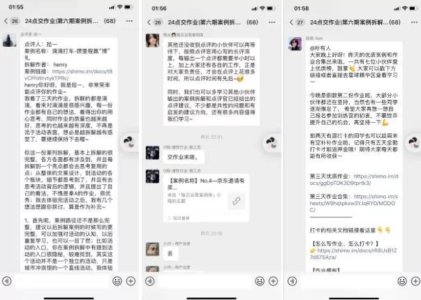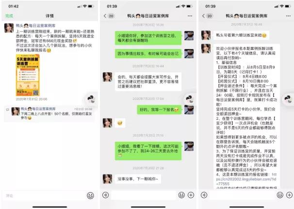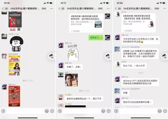 2)、學(xué)員在拆解完案例后,要將作業(yè)同步發(fā)到知識(shí)星球和社群內(nèi),對(duì)用戶而言,可以在群內(nèi)激起學(xué)員之間的比較心理,刺激未完成作業(yè)的同學(xué)提交作業(yè)。對(duì)零一而言,可以擴(kuò)大案例拆解訓(xùn)練營(yíng)在知識(shí)星球上的熱度,也可以提升知識(shí)星球的活躍度,同時(shí)為下期訓(xùn)練營(yíng)招生做宣傳準(zhǔn)備,