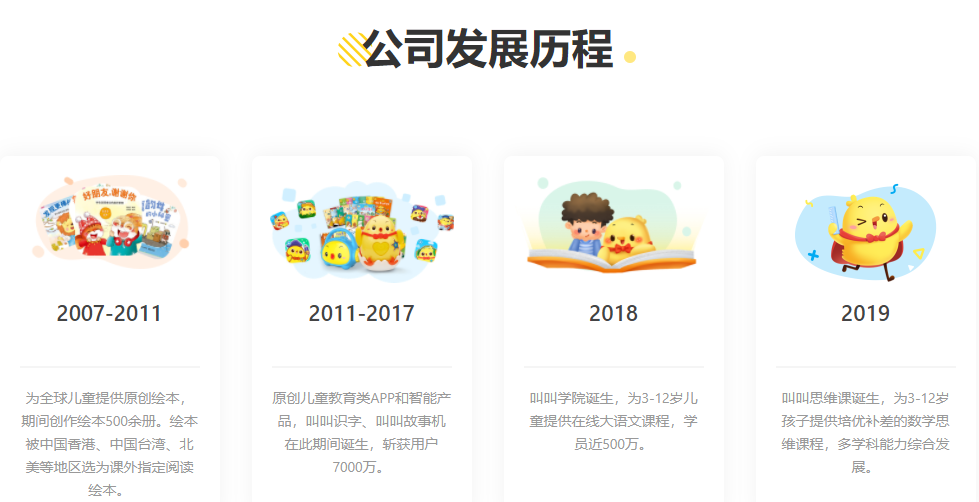 叫叫閱讀成立于2007年,旗下『叫叫識(shí)字』APP在兒童教育榜上排名前列,擁有一批兒童精準(zhǔn)流量,線上獲客效率較高;2014年月活用戶達(dá)到300萬(wàn);2017年『叫叫閱讀』誕生前,『叫叫系app』全球下載總量達(dá)5000萬(wàn)次,累積用戶達(dá)7000萬(wàn)