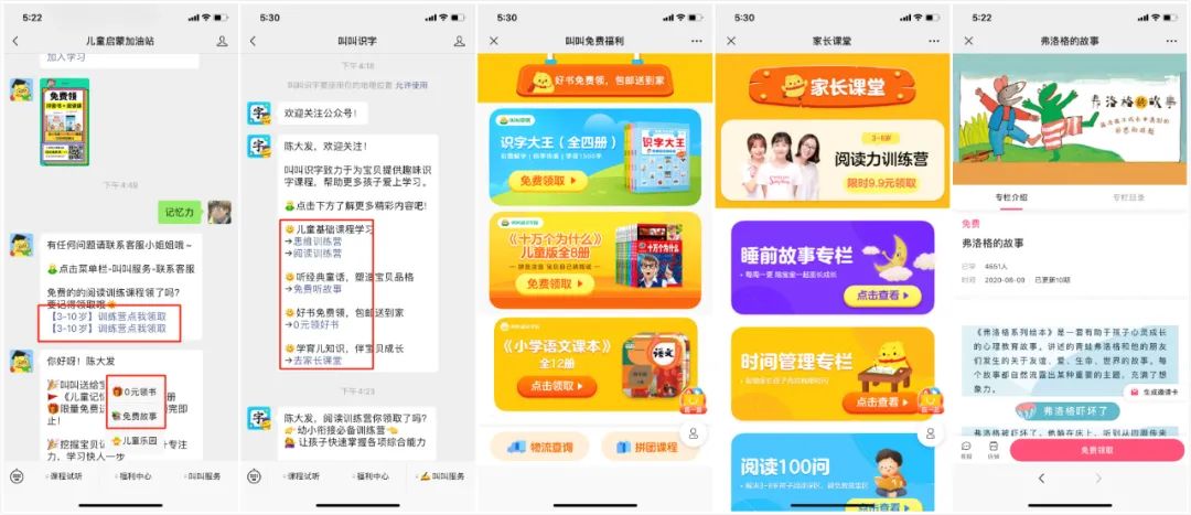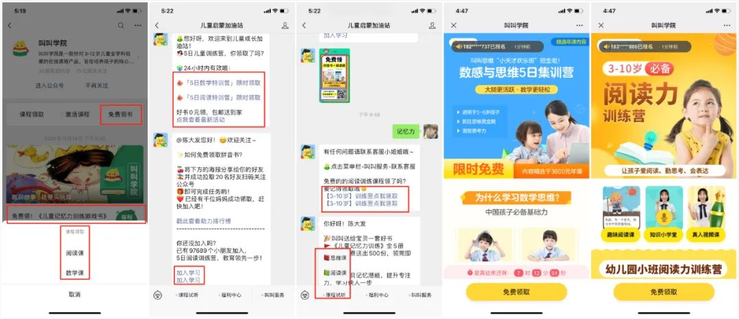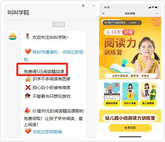 營(yíng)銷漏斗相關(guān)性,主要是保持頁(yè)面和潛在客戶認(rèn)為他們看到落地頁(yè)的相關(guān)性;而在叫叫閱讀的公眾號(hào)菜單欄、新好友應(yīng)答、抖音小紅書(shū)投放廣告上,都有明確說(shuō)明是5天閱讀力訓(xùn)練營(yíng),和落地頁(yè)內(nèi)容前后一致。