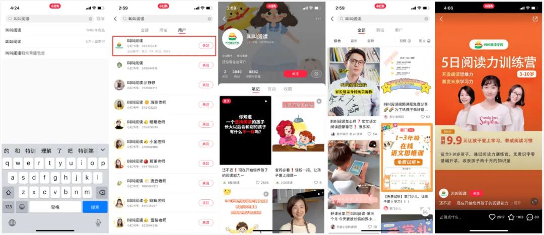小紅書(shū):1個(gè)官方賬號(hào),同抖音主推9.9元5日閱讀力訓(xùn)練營(yíng),以及KOL推廣&真實(shí)家長(zhǎng),n個(gè)老師號(hào)。