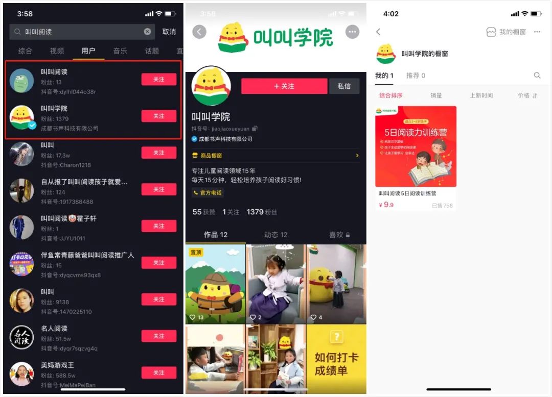 總結(jié):賬號(hào)少,粉絲點(diǎn)贊數(shù)都很少,櫥窗放的是9.9元閱讀力訓(xùn)練營(yíng)作為引流,可見(jiàn)抖音是剛?cè)刖?,但不是主?zhàn)場(chǎng),沒(méi)有放很大精力在這塊。