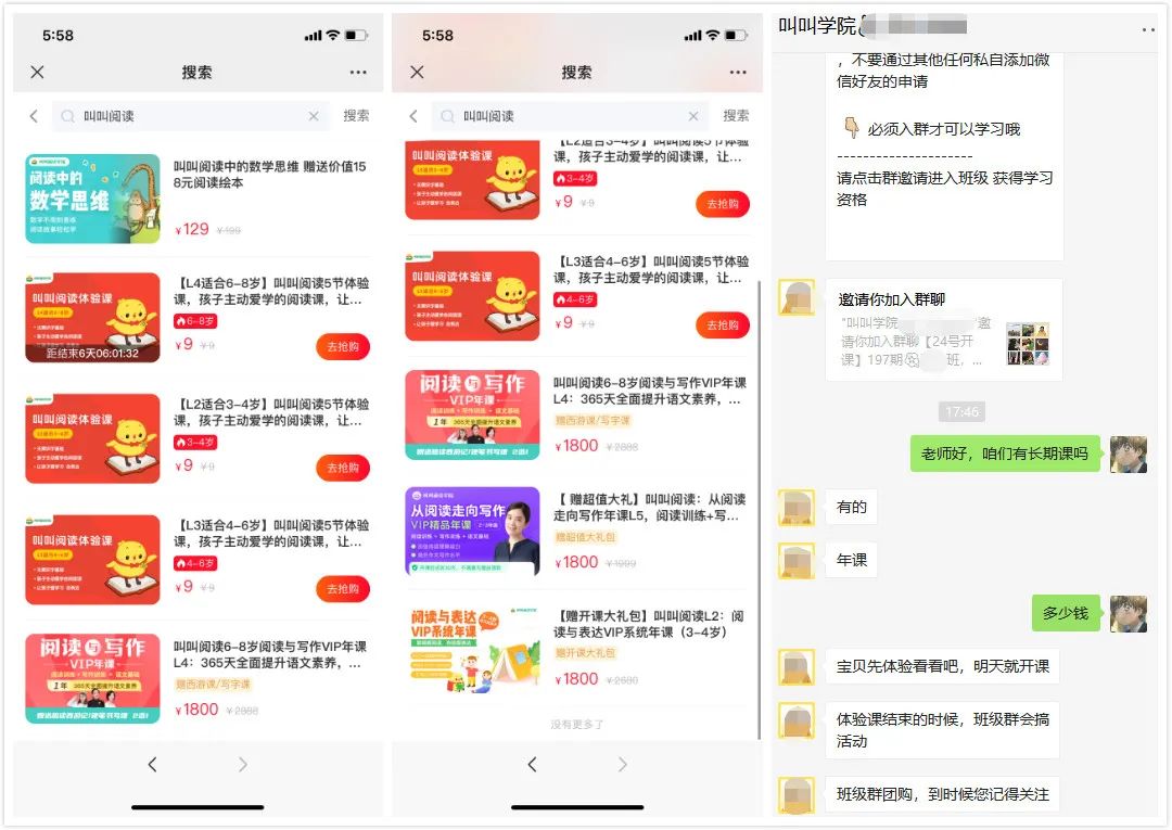 調(diào)研叫叫閱讀,百科的介紹也非常簡(jiǎn)單,官網(wǎng)、公眾號(hào)、APP、私聊助教都沒(méi)有正價(jià)課程的入口,豈不是浪費(fèi)了自然流量,還是說(shuō)主要依靠前期積累的流量,只做老帶新。