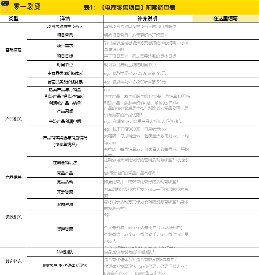 先填寫(xiě)項(xiàng)目前期調(diào)查表,了解和挖掘項(xiàng)目的背景、需求、預(yù)期效果、渠道情況、產(chǎn)品情況等等,為項(xiàng)目籌備做好第1步準(zhǔn)備工作。