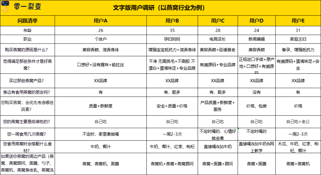 用戶需求調(diào)研首先要明確調(diào)研目的,為什么要做這一次的調(diào)研,清晰的調(diào)研能夠幫助項(xiàng)目迅速分類目標(biāo)用戶,建立清晰的用戶畫(huà)像。
