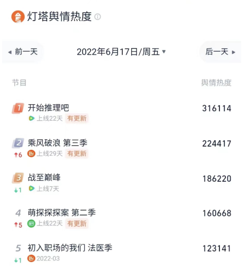 雖然“工作量指數(shù)級(jí)上漲”,但從數(shù)據(jù)反饋來看,《開始推理吧》也展現(xiàn)出了觀眾對(duì)連續(xù)劇式綜藝的熱情。據(jù)燈塔輿情熱度榜單,第三案播出后,《開始推理吧》當(dāng)日熱度突破316114,位居熱度第一名。