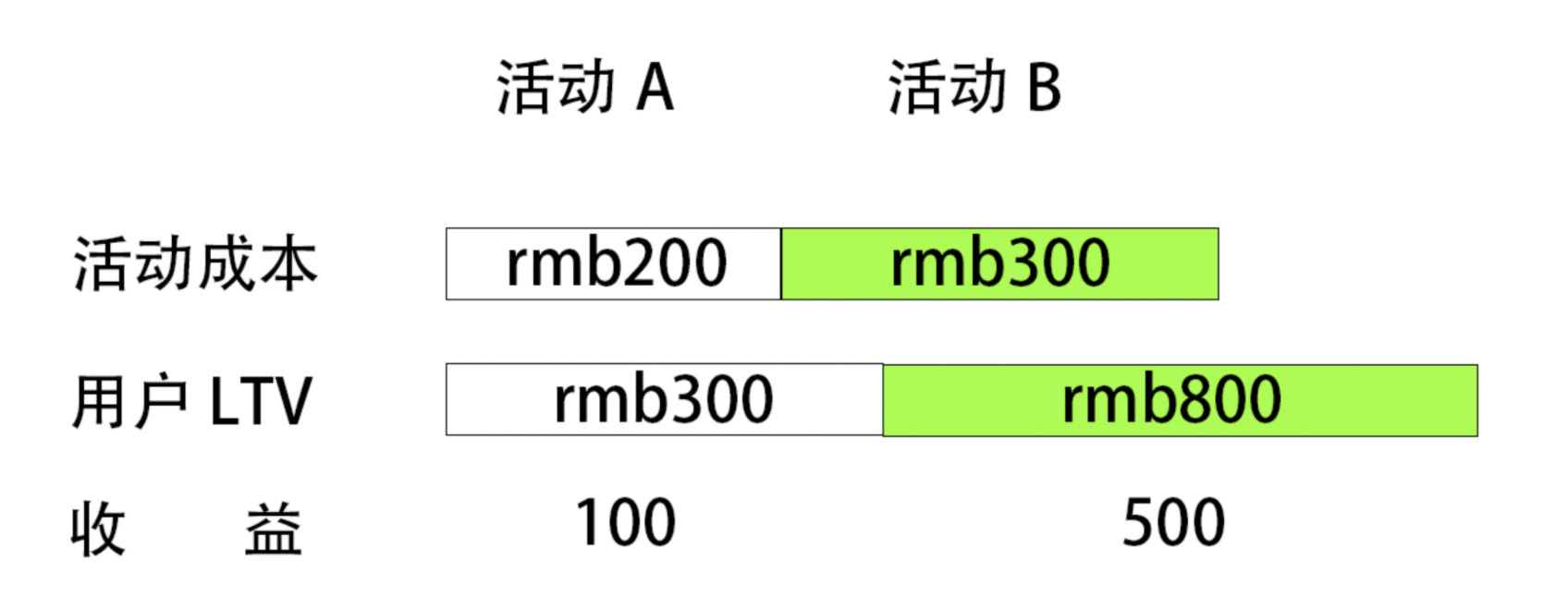 因?yàn)槊恳淮位顒游覀兌加谐杀荆ɑ顒营剟畛杀?、人力運(yùn)營成本等),所以我們同樣要計(jì)算用戶每一次活動的LTV,選擇受益最高的活動重復(fù)執(zhí)行,而收益低的活動,若無必要勿增實(shí)體。