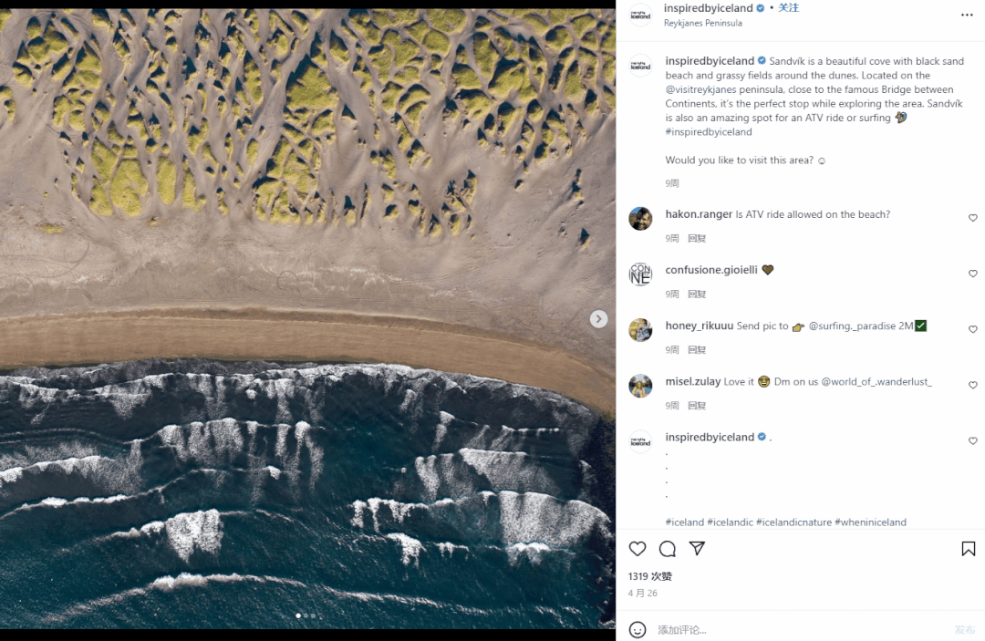 它創(chuàng)建了一個(gè)Instagram賬戶,現(xiàn)在已經(jīng)有16.1萬(wàn)名粉絲。在該賬號(hào)上,UGC內(nèi)容被用來(lái)宣傳冰島的美麗和其令人驚嘆的風(fēng)景,而UGC參與的活動(dòng)還有一個(gè)特定標(biāo)簽#inspiredbyiceland,現(xiàn)在也已經(jīng)被使用了超過(guò)463K次。這足以讓旅行者想再次背上行李一睹冰島的美貌。