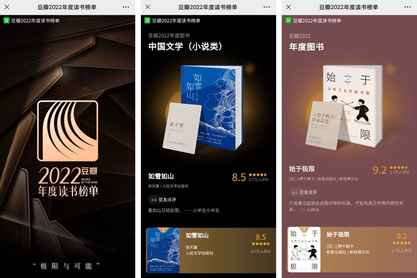 案例參考:這是由豆瓣讀書(shū)推出的年度賬單H5,H5對(duì)讀書(shū)內(nèi)容到優(yōu)質(zhì)作家,從線上榜單到互動(dòng)活動(dòng)都做了詳細(xì)介紹,給不知道接下來(lái)讀什么書(shū)的小伙伴一個(gè)參考,同時(shí)彰顯豆瓣讀書(shū)龐大的用戶(hù)體量,為平臺(tái)銷(xiāo)售和相關(guān)活動(dòng)引流。