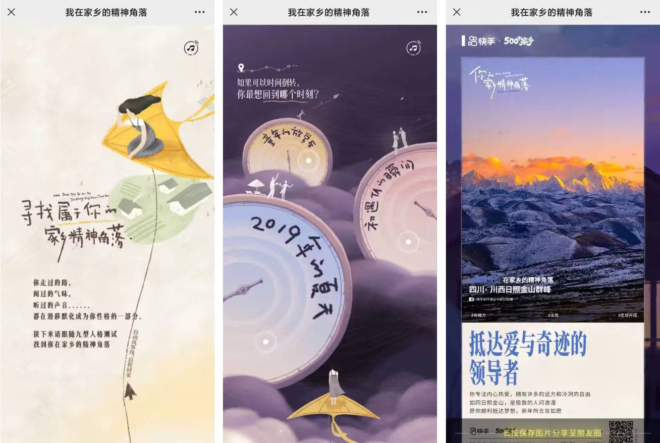 案例參考:這是由快手推出的答題測(cè)試H5活動(dòng)。以“我在家鄉(xiāng)的精神角落”為主題,引導(dǎo)用戶(hù)回憶家鄉(xiāng)的點(diǎn)點(diǎn)滴滴,喚起共鳴,生成帶有用戶(hù)姓名和家鄉(xiāng)的海報(bào),形成傳播和裂變,在即將到來(lái)的2023年春節(jié)之際,勾起更多在城市打拼的年輕人的思鄉(xiāng)之情。