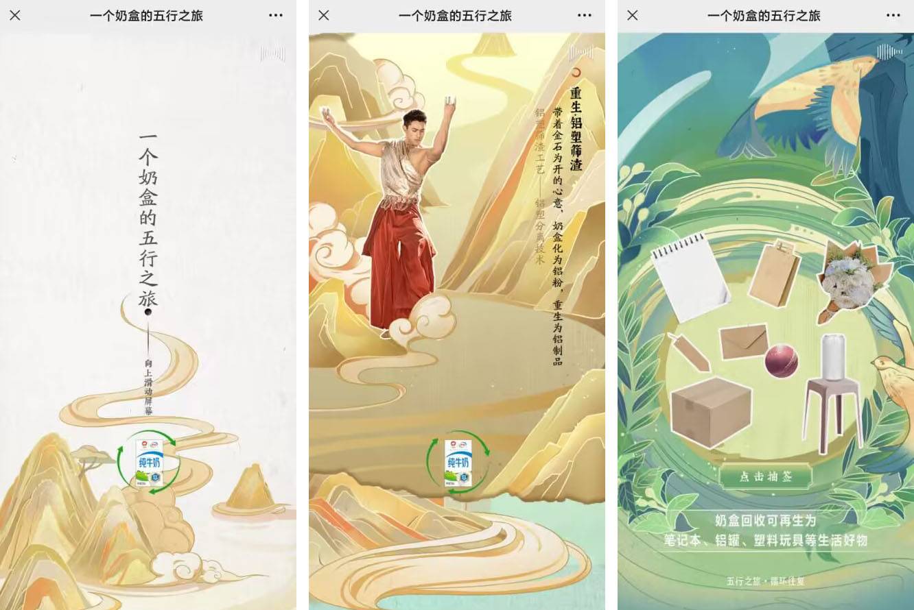 案例參考:這是由伊利為宣傳紙盒回收計(jì)劃推出的環(huán)保主題作品,將伊利牛奶包裝盒的資源回收再利用技術(shù)與傳統(tǒng)五行結(jié)合,讓用戶(hù)了解牛奶盒是怎樣變成生活用品的,宣傳傳統(tǒng)文化,以及伊利集團(tuán)保護(hù)環(huán)境的品牌理念和社會(huì)責(zé)任感,加強(qiáng)用戶(hù)對(duì)品牌的好感。