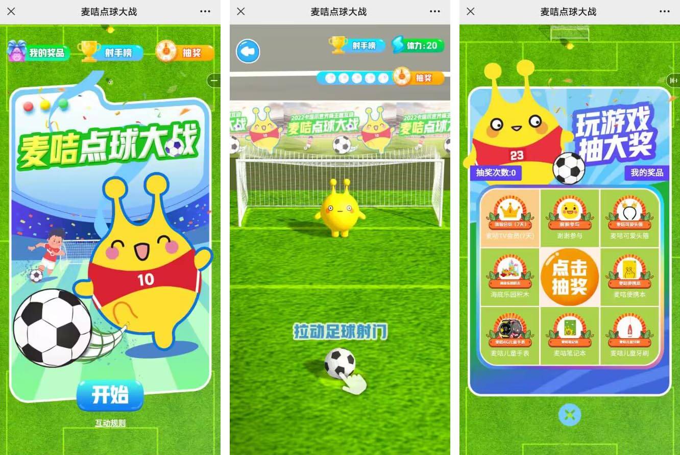 案例參考:這是由麥咭TV推出的抽獎(jiǎng)H5活動(dòng),采用H5互動(dòng)游戲+抽獎(jiǎng)的形式,由品牌吉祥物麥咭公仔來(lái)當(dāng)守門(mén)員,邀請(qǐng)用戶(hù)踢球,每滿(mǎn)五個(gè)進(jìn)球即可獲得一次抽獎(jiǎng)機(jī)會(huì)。