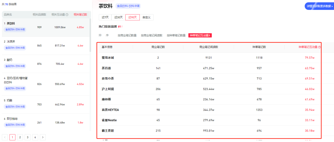 在新紅數(shù)據(jù)品類搜索-食品飲料-飲料沖調(diào)排名中熱度最高的是【茶飲料】,近3個(gè)月來的實(shí)時(shí)熱度為2211.41萬,超過95.52%的飲料沖調(diào)品類詞,其中熱門投放品牌大多都是奶茶類品牌。