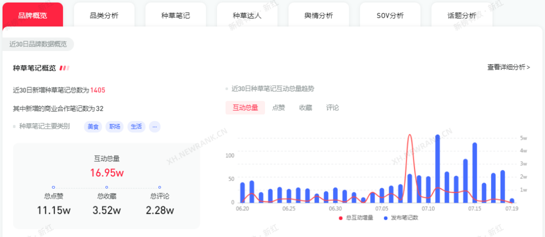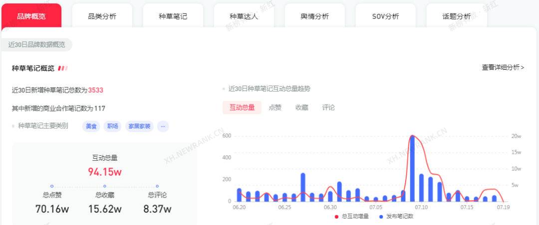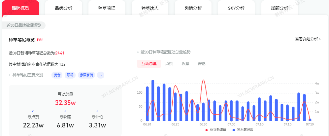 據(jù)新紅數(shù)據(jù)顯示,霸王茶姬近30天的總互動(dòng)為32.35萬,6月第品牌處于鋪量階段,相較之下每天發(fā)布的種草筆記較多,但是互動(dòng)量數(shù)據(jù)不太好,我們看到6月30日,互動(dòng)量數(shù)據(jù)達(dá)到頂峰,當(dāng)天互動(dòng)量總增量提高4.44w。近30天來霸王茶姬共發(fā)布2441篇種草筆記,總評(píng)論為3.31w,用戶評(píng)論率為8%。