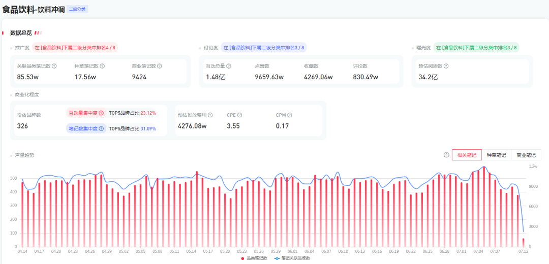 如圖所示,近3個(gè)月以來,飲品類的預(yù)估閱讀量達(dá)到了34.2億,你沒有看錯(cuò),是3個(gè)月曝光34.2億。在這個(gè)不容忽視的數(shù)據(jù)背后,足以見證飲料行業(yè)在近期的火爆程度。伴隨著消費(fèi)者對(duì)個(gè)性化、健康保健的迫切追求,各大品牌紛紛加大在營(yíng)銷和創(chuàng)新上的投入,試圖在這個(gè)市場(chǎng)競(jìng)爭(zhēng)中搶占先機(jī)。