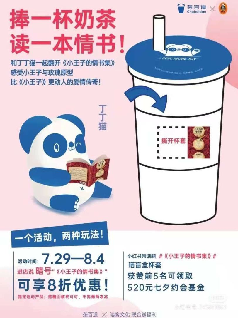 描繪小王子與玫瑰原型的《小王子情書集》是動人的愛情傳奇,茶百道與熊貓君攜手,在8月4日當天上海地區(qū)購買飲品可獲聯(lián)名杯套并且撕開杯套參與《小王子情書集》的抽獎。