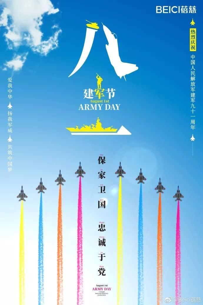 蓓慈的海報也值得借鑒,它將飛機、坦克、軍艦巧妙的融進了八一中,八架飛機代表八、拉出的直線代表一也是八一,表現(xiàn)了蓓慈致敬八一建軍節(jié)的心。