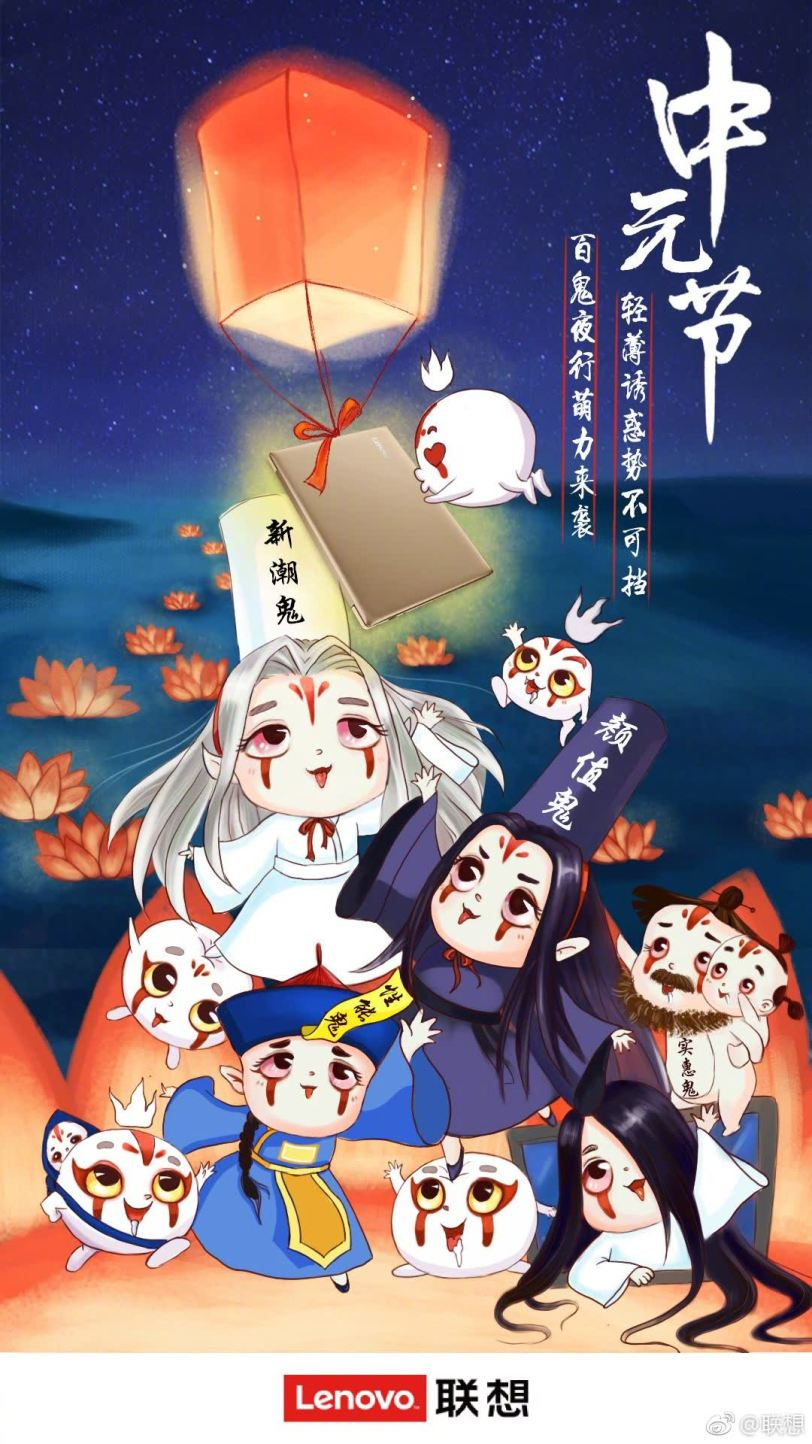 聯(lián)想將中元節(jié)與傳說百鬼夜行聯(lián)系在一起制作海報,通過Q版的人物增加對讀者的吸引力,配文:“中元節(jié),賣個萌!百鬼夜行萌力來襲,輕薄誘惑勢不可擋。”