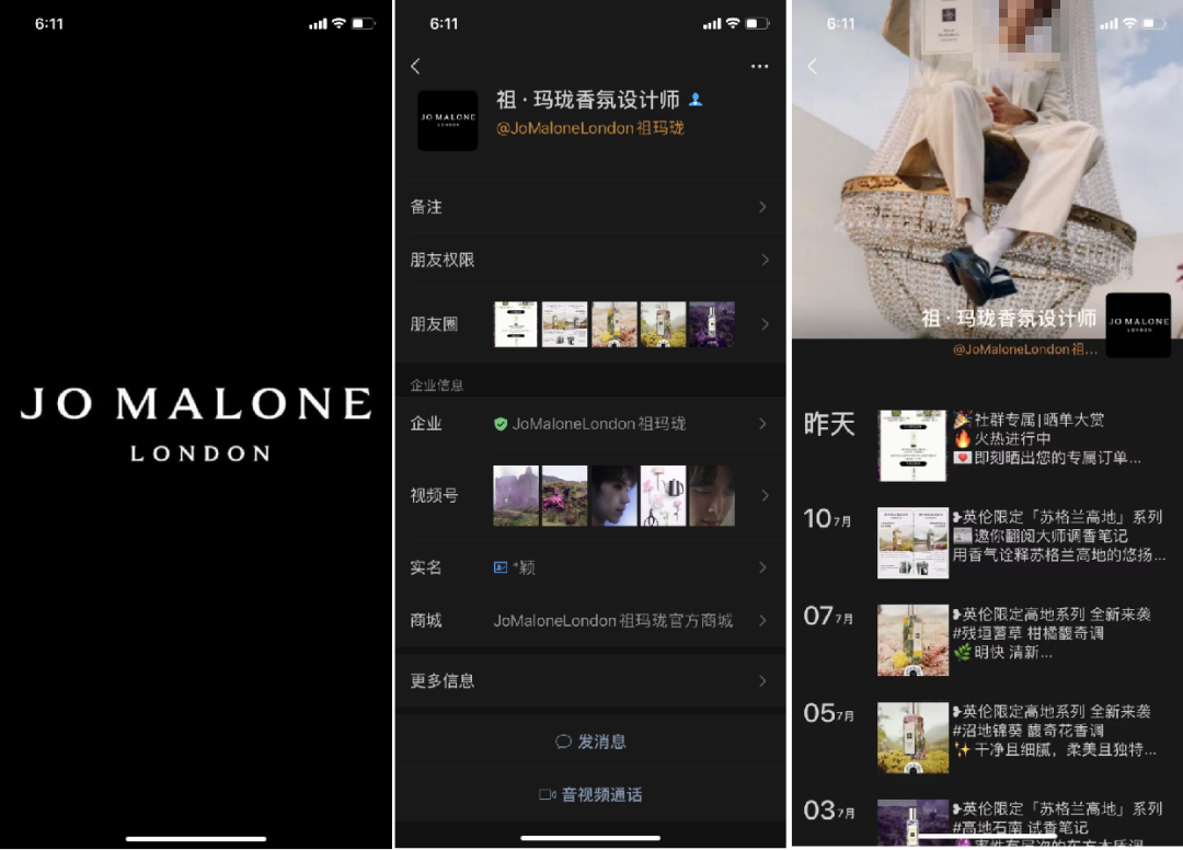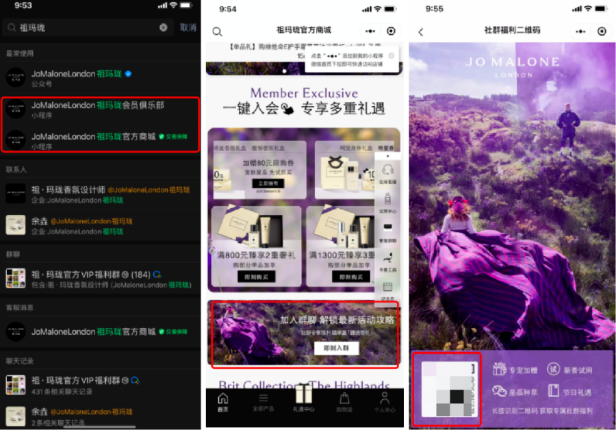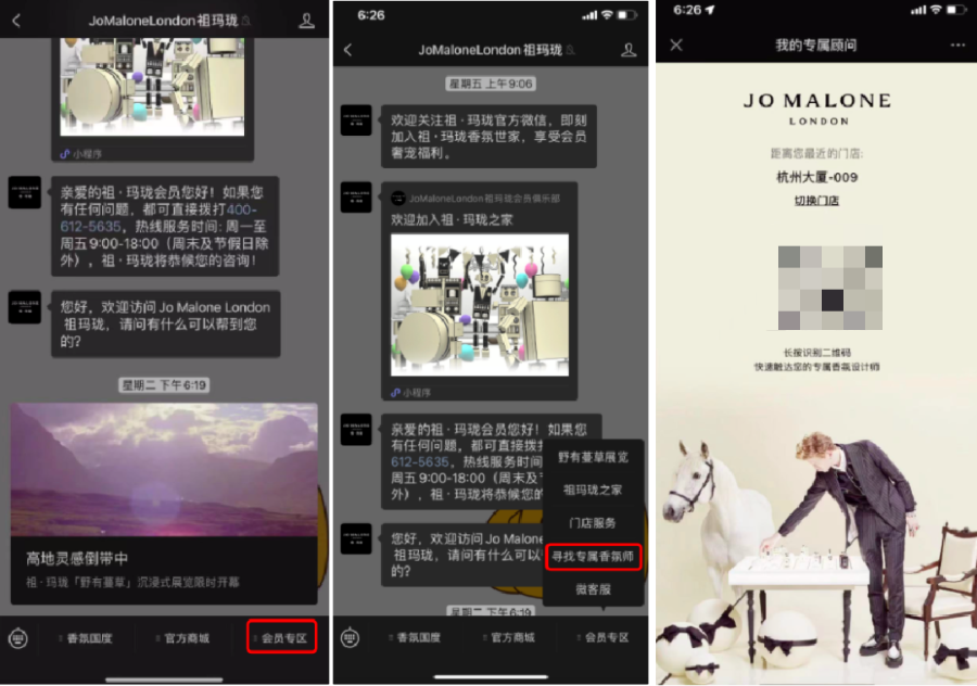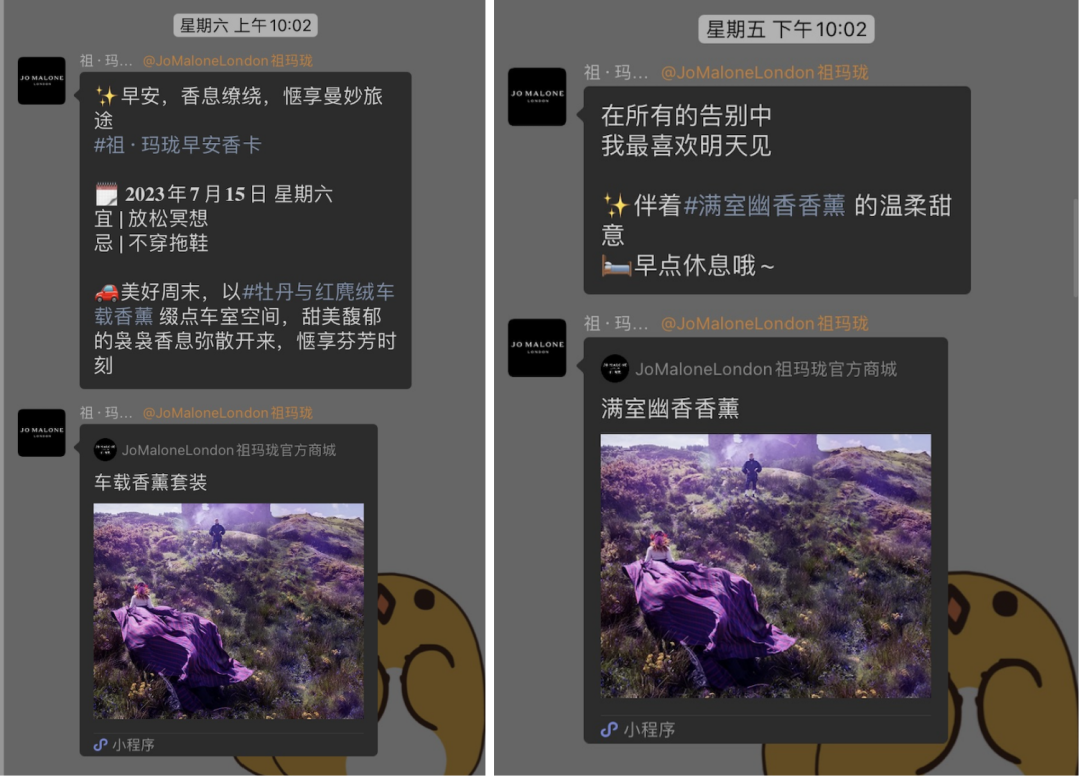 「JoMaloneLondon祖瑪瓏」公眾號在打招呼語跟菜單欄中都設(shè)置了私域社群的引流入口具體路徑:
