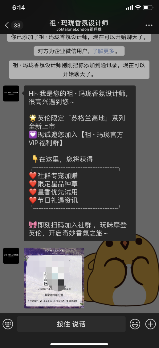 祖瑪瓏對客服微信進行了精細化打造,企業(yè)IP的角色以香氛設(shè)計師為主。主要以新品種草、試用征集,發(fā)送節(jié)日福利為主。