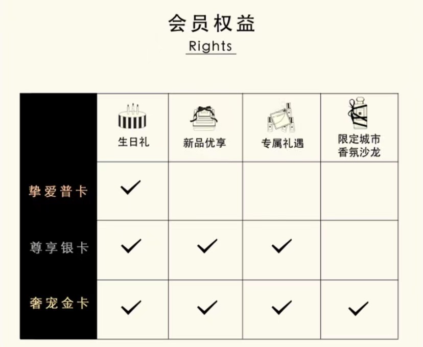 奢寵金卡:一次性或連續(xù)12個月累計實付消費金額滿5000元,享享生日禮、新品優(yōu)享、專屬禮遇、限定城市香氛沙龍權(quán)益
