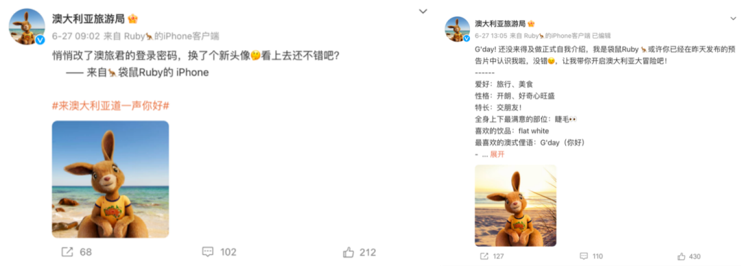 整體來看,Ruby萌萌的形象、充滿social感的性格激發(fā)了用戶關(guān)注與互動(dòng)的欲望,接下來以趣味的熱搜話題#澳大利亞頂流原來是它#,達(dá)到Ruby知名度、影響力的破圈,引流到線下打卡,再進(jìn)一步回流到線上分享。綜合性的旅游熱搜話題#澳大利亞還有多少驚喜#承接了流量,實(shí)現(xiàn)了種草轉(zhuǎn)化。澳大利亞旅游局在微博打通了從關(guān)注形象、分享內(nèi)容,到種草目的地旅游的營銷路徑。