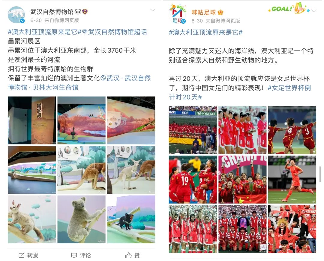 @悅游中國、@Voyage新旅行等旅行媒體官方微博也在話題中對Ruby和動(dòng)畫電影《G’day》進(jìn)行預(yù)告和展示。還有眾多跨界藍(lán)V官方賬號參與夢幻聯(lián)動(dòng):@武漢自然博物館推薦館內(nèi)的澳大利亞相關(guān)展覽,@咪咕足球 介紹了即將在澳大利亞舉辦的女足世界杯。一系列話題內(nèi)容通過文博、運(yùn)動(dòng)等不同角度,帶用戶感受澳大利亞的多樣化魅力。
