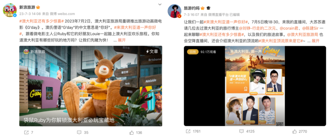 各類微博賬號以多種形式分享澳大利亞的旅游印象與體驗(yàn)。在視頻、圖文內(nèi)容之外,還有深度解析種草的長文,以及交流感拉滿的直播連麥。@新浪旅游在《G’day》微電影上線后,發(fā)布長文章,細(xì)數(shù)微電影中Ruby到訪過的目的地,展現(xiàn)Ruby的同款旅游打卡線路;@旅游約嗎 直播連麥@澳大利亞旅游局 及多位旅游達(dá)人,大家共同回憶澳大利亞的旅游感受,@澳大利亞旅游局 還給到了很多旅行實(shí)用建議。