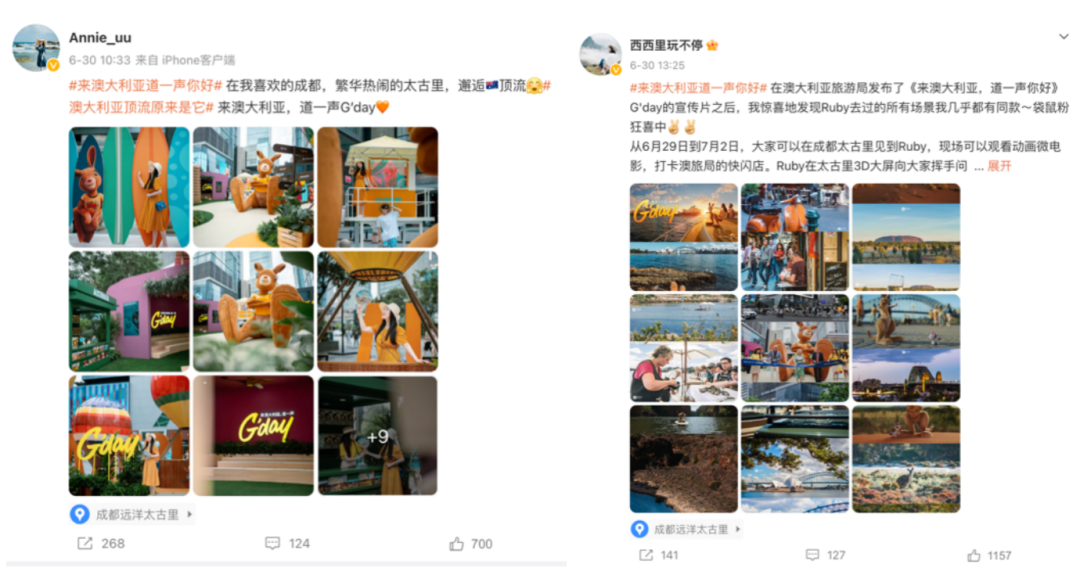 在微博收獲了滿滿的好感度之后,Ruby宣布自己即將空降中國成都,通過“來澳大利亞,道一聲你好”活動(dòng),真實(shí)地在線下與網(wǎng)友見面。@Annie_uu 、@西西里玩不停等眾多達(dá)人在#澳大利亞頂流原來是它#話題下分享了打卡體驗(yàn)。用戶在位于成都遠(yuǎn)洋太古里的澳大利亞旅游局品牌官方快閃店現(xiàn)場,既可以與超大的袋鼠Ruby合影,還能觀看動(dòng)畫微電影,打卡充滿澳式元素的裝飾。