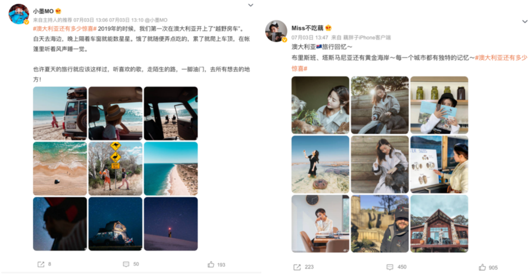 在實(shí)現(xiàn)熱度引爆后,@澳大利亞旅游局通過#澳大利亞還有多少驚喜#話題,滿足了用戶對于目的地旅游魅力進(jìn)一步了解的需求。與趣味性的話題不同,#澳大利亞還有多少驚喜#更多地聚焦在澳大利亞的自然、人文、美食等全方位的旅游攻略內(nèi)容上。旅游及各領(lǐng)域的達(dá)人分享出自己美好的澳大利亞旅游記憶,呈現(xiàn)出一個(gè)更加豐富多彩的旅游目的地。