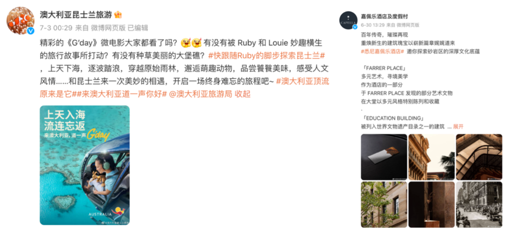 澳大利亞各地的旅游局、酒店的官方微博也在話題中持續(xù)進(jìn)行旅游體驗(yàn)自薦,@澳大利亞昆士蘭旅游推薦令人流連忘返的上天入海體驗(yàn),@嘉佩樂酒店及度假村展示了其新開業(yè)的悉尼嘉佩樂酒店的深厚文化底蘊(yùn)與藝術(shù)美學(xué)。
